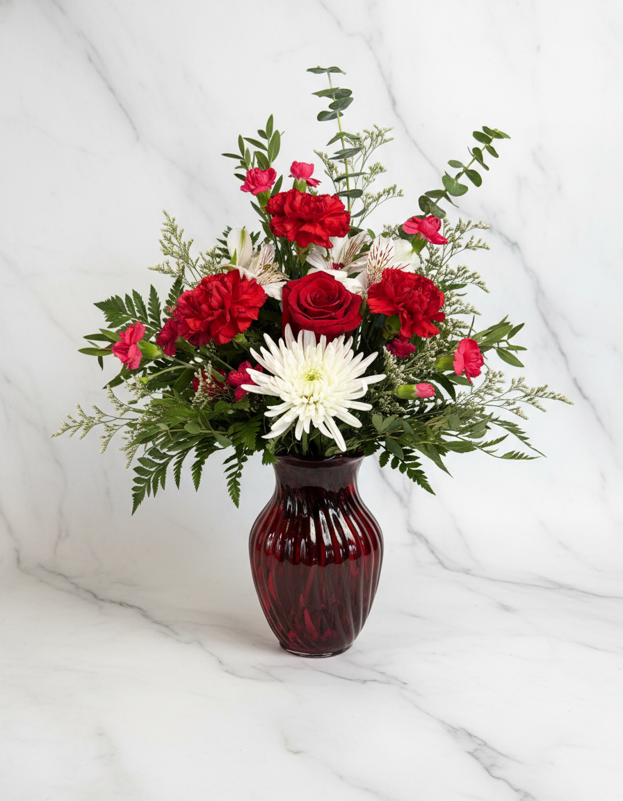 Bold red blooms paired with soft white accents for a romantic Valentine's day favorite that says it all- "Crazy 4 U"