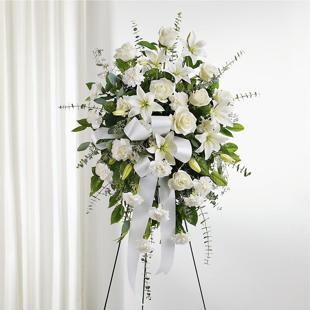 An elegant tribute to a cherished life, our With Care Standing Spray is a captivating mix of white carnations, roses and lilies.
